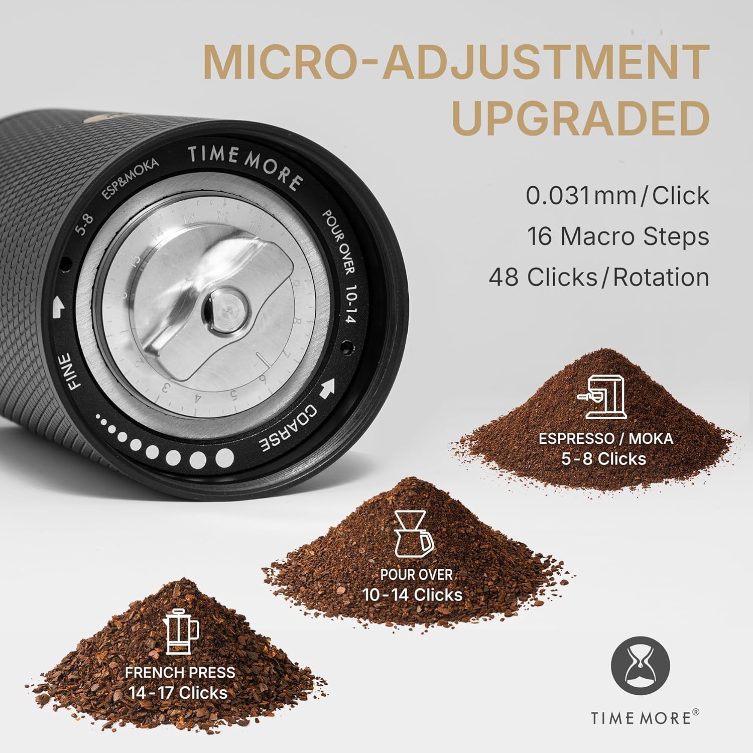 Precise 0.031mm Clicks: Dial in any brew method perfectly. Timemore C5 PRO coffee bean grinder features 16 macro and 48 micro steps for accurate, point-to-point dialing, helping you switch between brewing methods without guesswork.