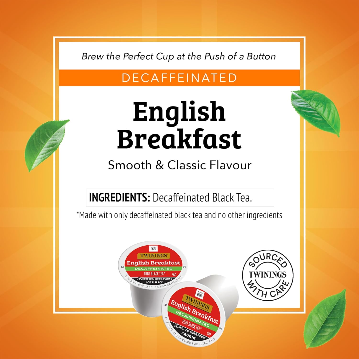 DECAFFEINATED ENGLISH BREAKFAST TEA K-CUP PODS: One box of 24 Decaf Twinings English Breakfast Tea Pods; Our most popular tea without all the caffeine; making it a special treat any time of day
