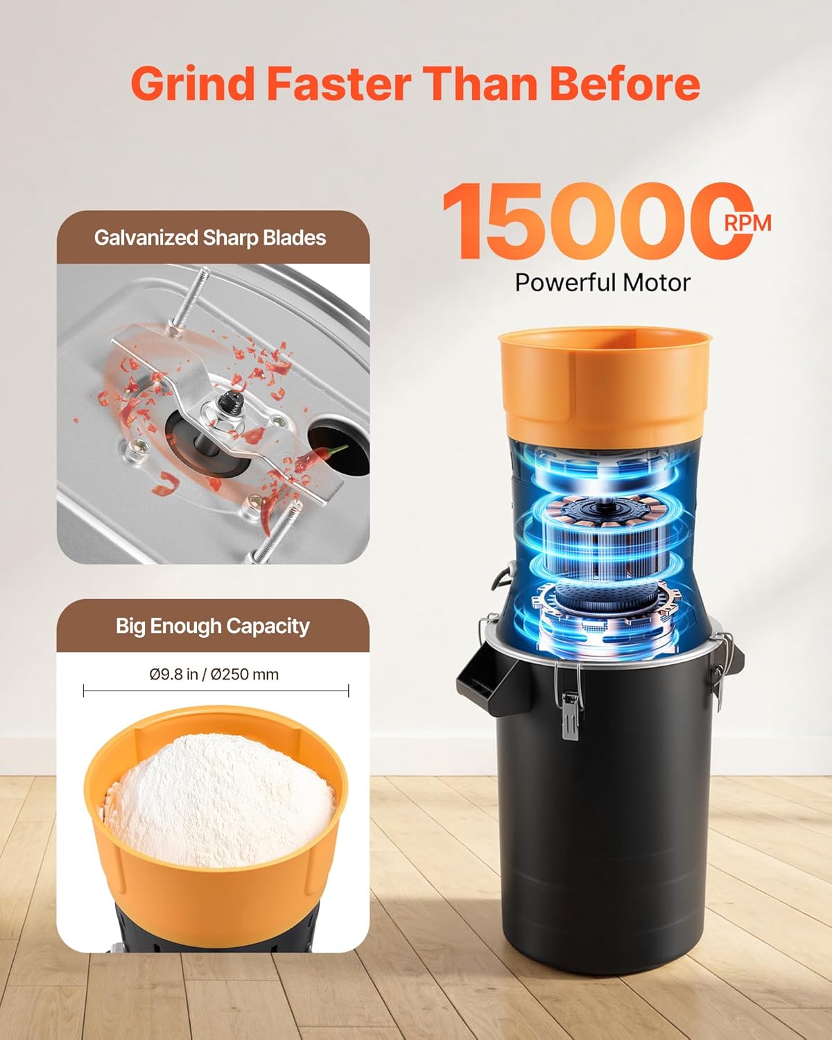 High-Speed Powerful Grinding: A 600W motor reaching 15,000 RPM works with a 9.8 in feed port and sharp galvanized blades, letting this grain mill grinder deliver efficient, stable grinding with low vibration during long operation