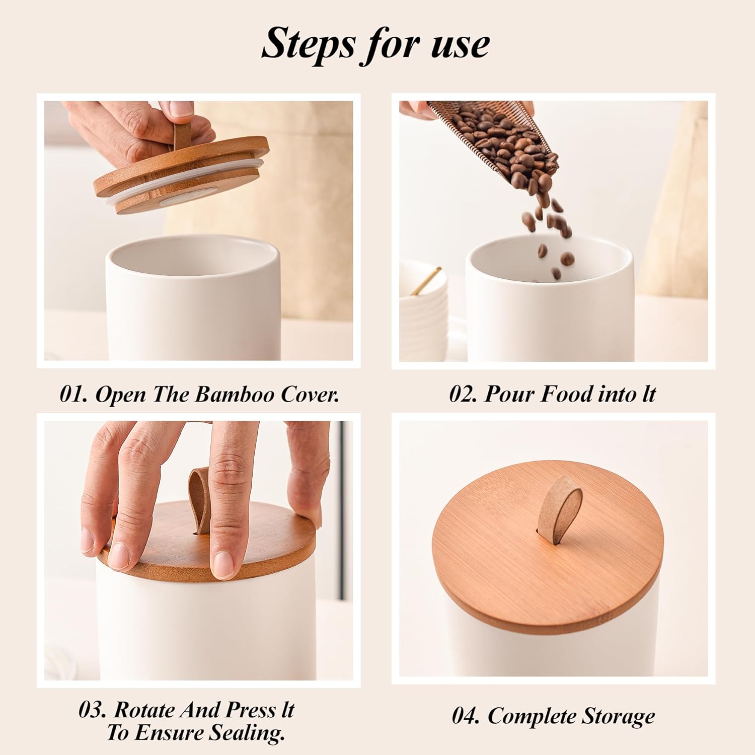 Elegant & Functional Countertop Organizer – The sleek ceramic finish paired with bamboo accents adds a touch of elegance to any kitchen. The wide jar openings allow for easy filling and scooping, making them both practical and stylish for daily use. Ideal for modern, rustic, or farmhouse-style kitchens.