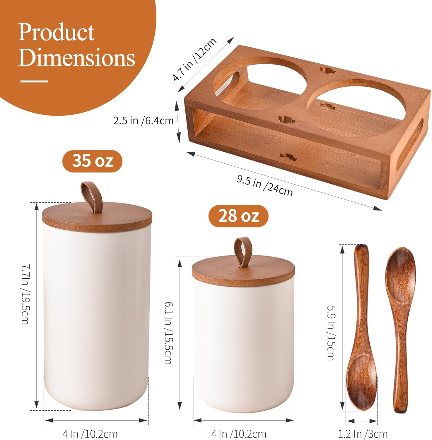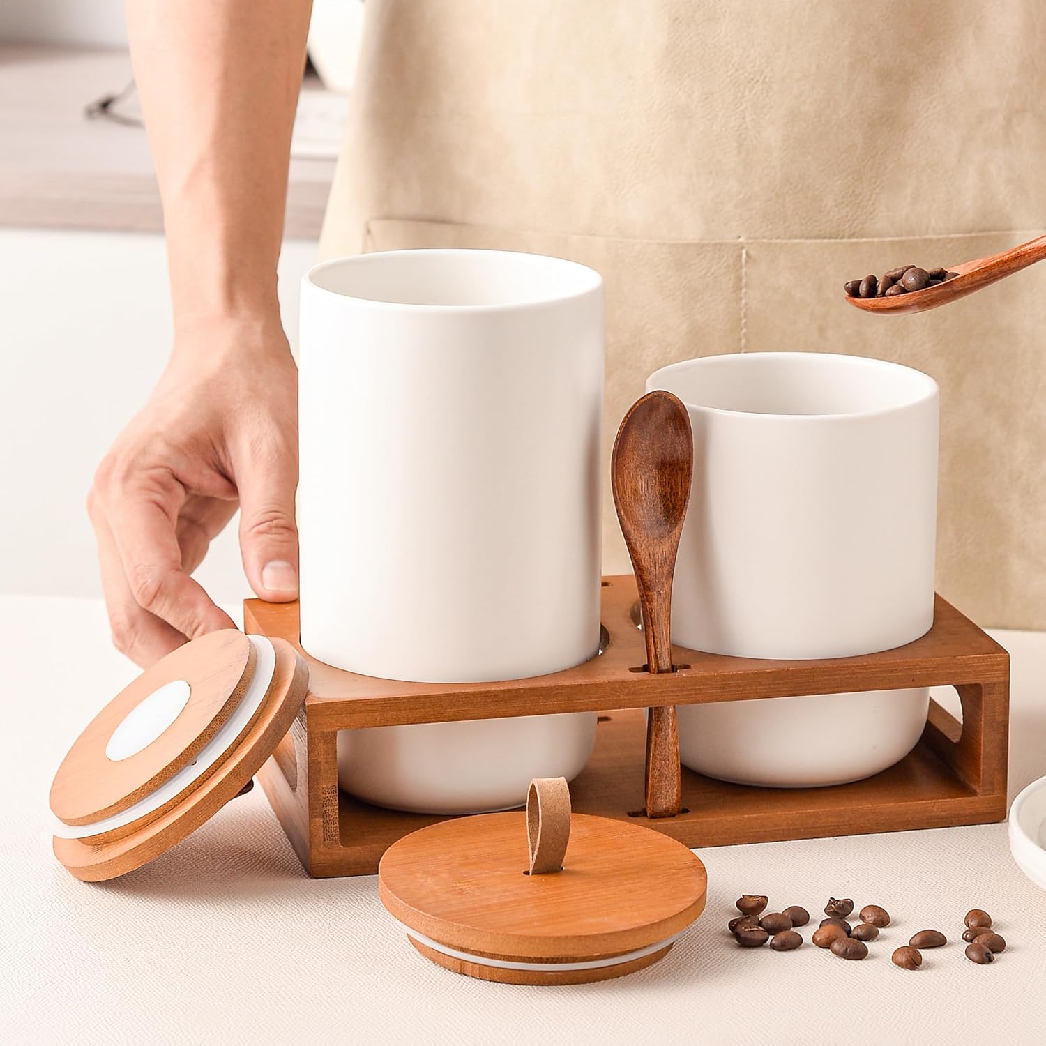 White Ceramic Canister Set of 2 with Bamboo Lids, Wooden Stand & Spoons – 35oz & 28oz Airtight Food Storage Jars for Coffee, Sugar, Tea, Kitchen Counter Organizer